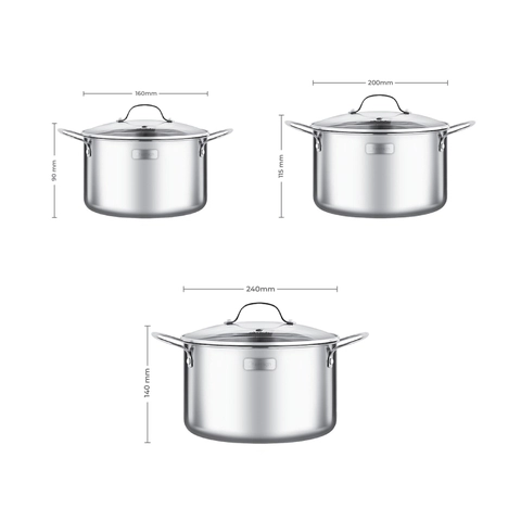 Đa dạng kích cỡ, đáp ứng mọi nhu cầu đun nấu:Bộ sản phẩm gồm 3 nồi các kích cỡ 16 – 20 – 24cm, phù hợp với nhiều nhu cầu nấu nướng cùng lúc trong bữa ăn nhờ đó tiết kiệm thời gian và nhiên liệu tối đa. Ngoài ra, một bộ nồi inox cao cấp còn mang tới vẻ đẹp đồng bộ cho căn bếp và tạo cảm hứng nấu ăn cho các bà nôi trợ.