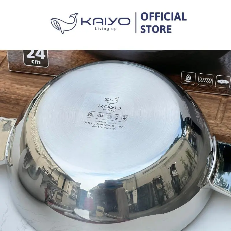 – Lớp ngoài cùng tiếp xúc với mặt bếp là inox 430 nguyên tấm cho hiệu suất bắt từ cao nhất. Nồi chảo inox Tri-Ply Kaiyo dùng trên mọi loại bếp kể cả các bếp từ khó tính, bếp điện, bếp hồng ngoại, bếp gas,….