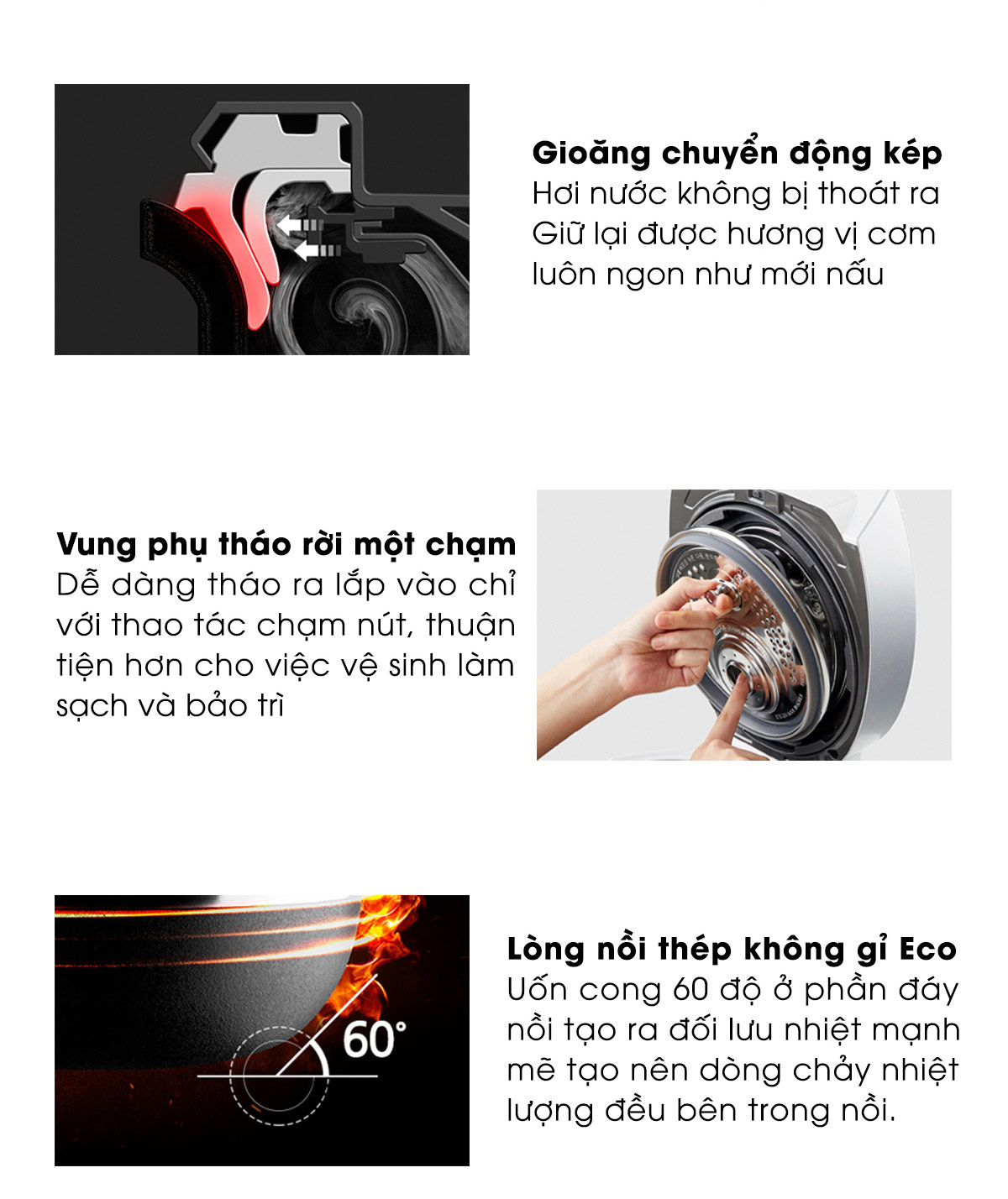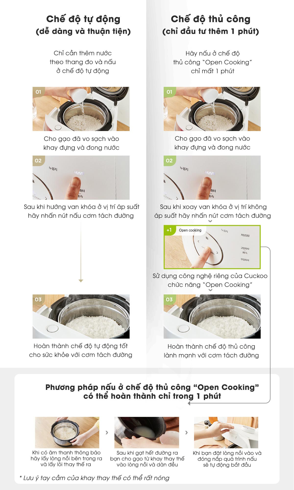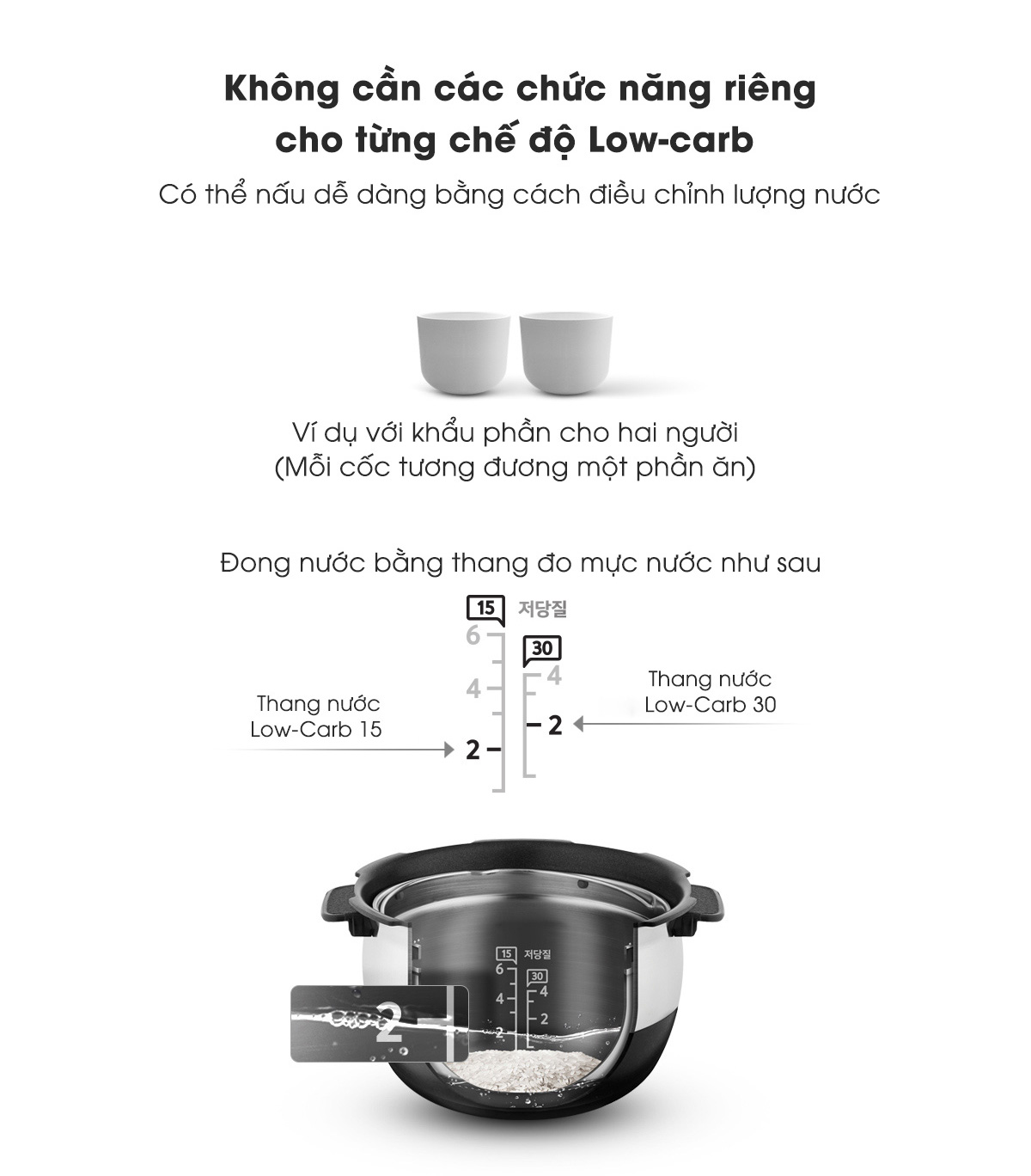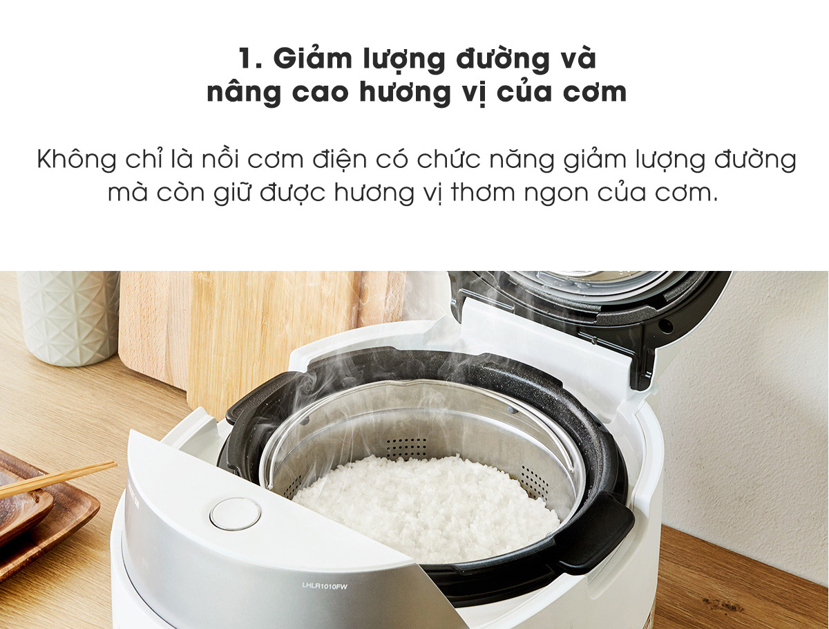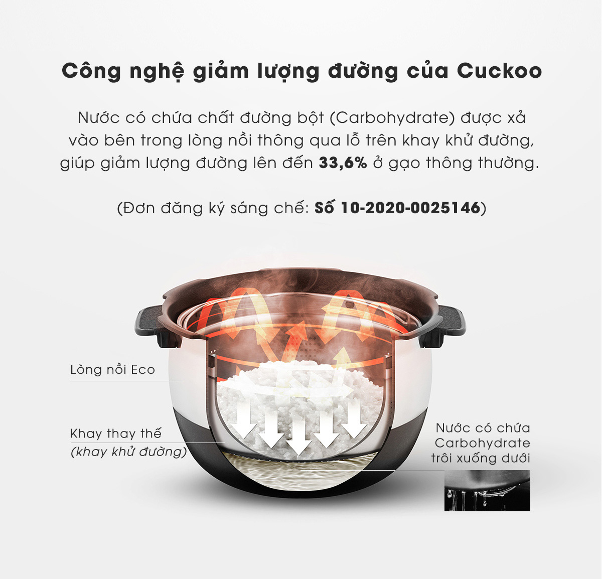 Giờ đây bạn có thể nấu cơm hàm lượng đường (Carbohydrate) thấp bằng khay thay thế (khay tách đường) đi kèm sản phẩm và chức năng nấu cơm tách đường tích hợp trên nồi. Chức năng này phù hợp cho những người ăn kiêng, ăn theo chế độ, người mắc hoặc có nguy cơ mắc tiểu đường.