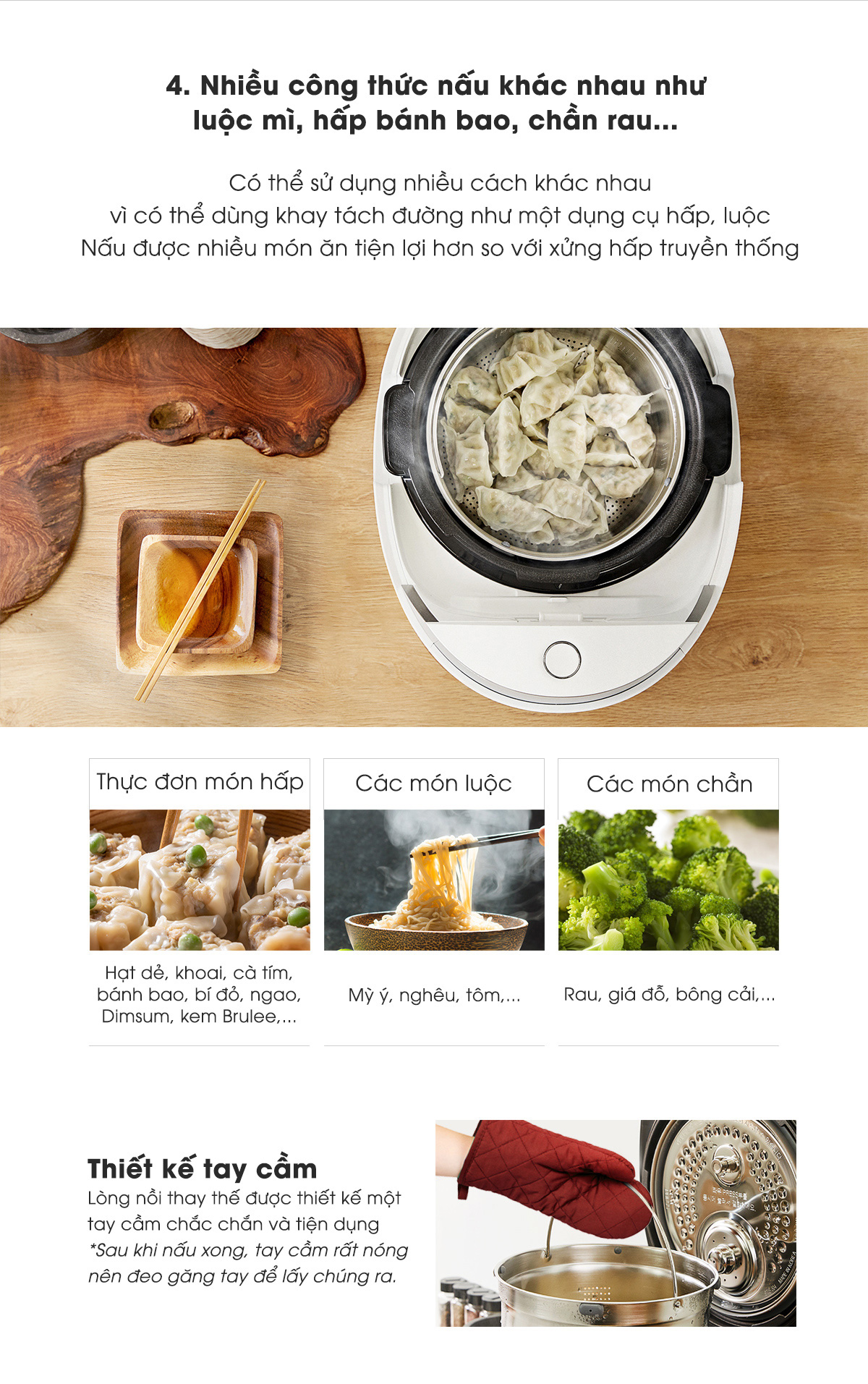 - Các chức năng nấu: Gạo nếp, gạo tẻ, nấu nhanh, ngũ cốc, cơm trộn, gạo lứt, cơm cháy, hầm hấp, nấu cháo…