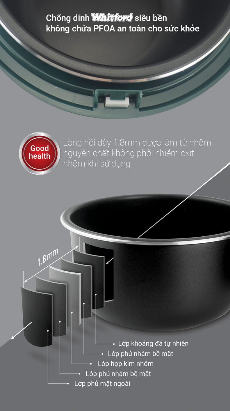 - Chất liệu lòng nồi: Lòng nồi dày 1.8mm được làm từ nhôm nguyên chất không phôi nhiễm oxit nhôm khi sử dụng, vừa có tuổi thọ cao mà đảm bảo an toàn.