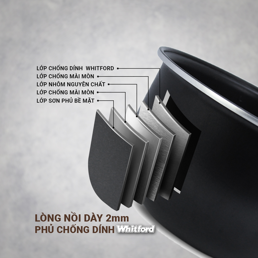 C. Lòng nồi dày 2mm phủ chống dính Whitford cao cấp