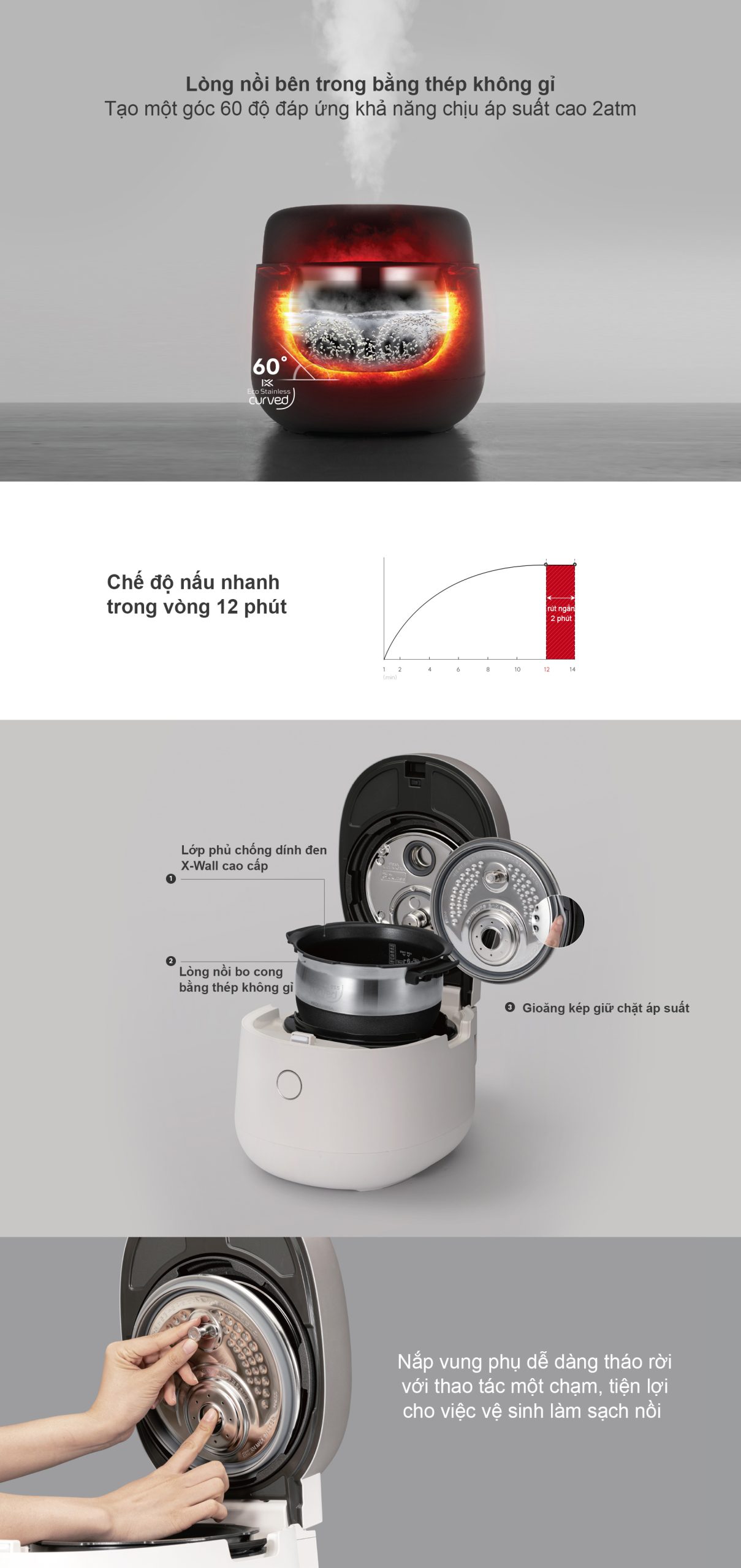 Sản phẩm nồi cơm điện CRP-NHTR1010FW mang đến công nghệ áp suất xi lanh hiện đại, giúp giảm tiếng ồn trong quá trình nấu và xả áp. Loại bỏ các chi tiết thừa để tạo nên thiết kế nguyên khối độc đáo và sang trọng. Chế độ khóa van tự động cũng màn hình điều khiển cảm ứng đem lại trải nghiệm tuyệt vời hơn cho người sử dụng.