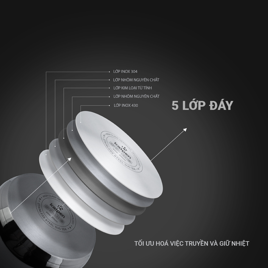 - Bếp từ: Nồi Inox 5 lớp đáy của Kalpen với lớp ngoài cùng là inox 430 có khả năng dẫn nhiệt tốt, phản ứng từ nhanh, giúp nồi nấu nướng nhanh chóng, hiệu quả hơn trên bếp từ.
