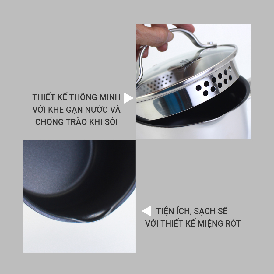 Viền vung là inox to bản với 2 hệ thống khe lọc thức ăn có kích thước khác nhau giúp người dùng dễ dàng rót và lọc thức ăn.